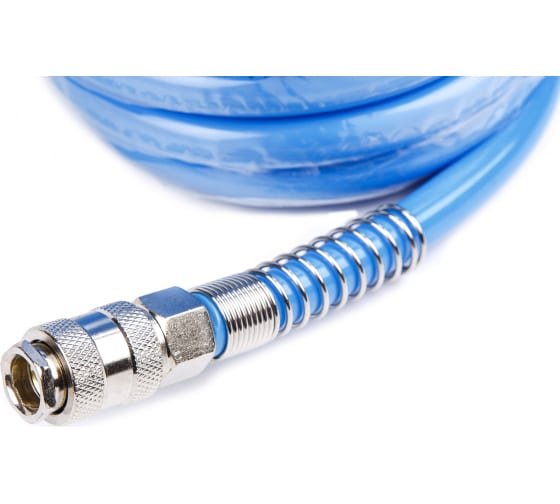 Полиуретановый спиральный шланг применяется для подачи воздуха от компрессора или линии сжатого воздуха к пневмоинструменту. За счет своей формы в виде спрали, шланг имеет достаточно компактный размер и не мешается под ногами. Как следствие - минимальный риск падения персонала. При этом, в растянутом виде шланг имеет длину 10 м, что позволяет комфортно работать с пневмоинструментом. С двух сторон шланг оснащен резьбовыми наконечниками для подключения быстросъемных соединений.