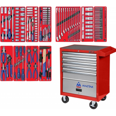 Набор инструментов торговой марки МАСТАК состоит из 186-ти предметов, и включает в себя 10 ложементов. Предназначен для организации рабочего места в любом производственном помещении, станции технического обслуживания или авторемонтной мастерской. Набор размещается в тележке МАСТАК 522-05581R.