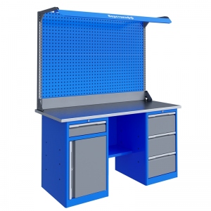 Верстак серии Technic 161.38.1-2F состоит из столешницы шириной 1596 мм, тумбы P3 с тремя большими ящиками, тумбы P8 с малым ящиком и отделением с дверью, полки-стенки, двойного экрана с кронштейнами и комплекта освещения.